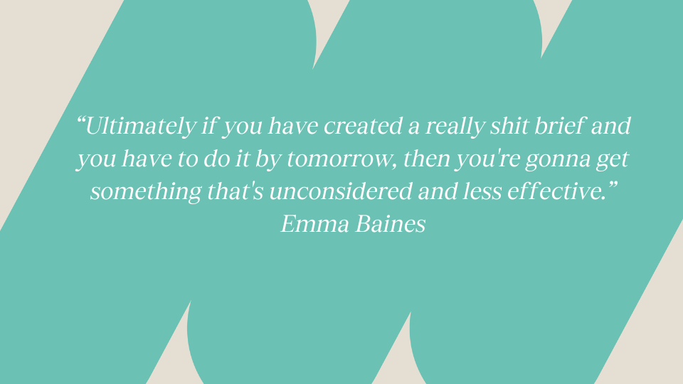 Emma: The best businesses do! Generally though there’s a feeling that creativity can solve everything. We can solve certain things but we can't solve everything. I think there's an understanding that we need to build out and educate others. I'm constantly saying this to my team: we have to educate people on the creative process, because it’s like an hourglass. We have a problem and then we blow it out and explore further. Then we come back in and we blow it out again because we might not hit it the first time in terms of what we're trying to achieve. I think people who don't work in our industry or don't work in this area see it as a more linear process, and it's just not like that.