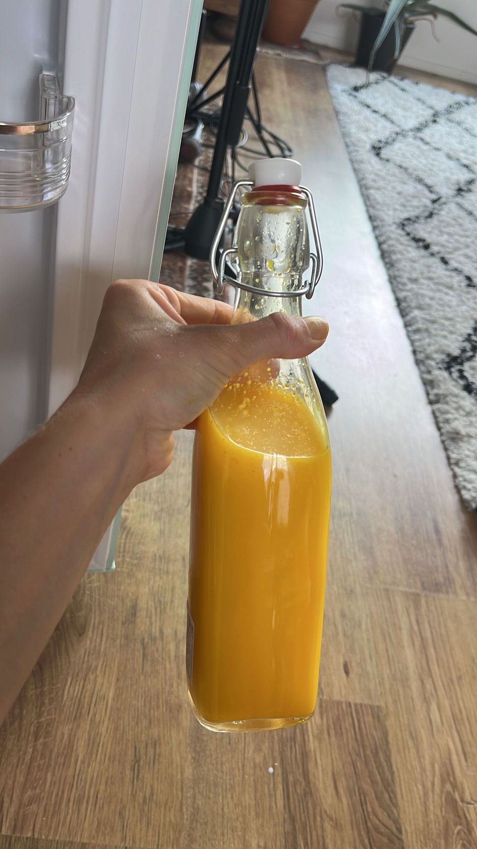 Stop het gele goedje (eh..) in een fles en vul het aan met water óf kokoswater. Zet ’t lekker weg in de koelkast. Drink het op als het koud is en gooi er voordat je dat doet nog een snufje peper in. Dan schijnt het nog beter dan goed te zijn.
