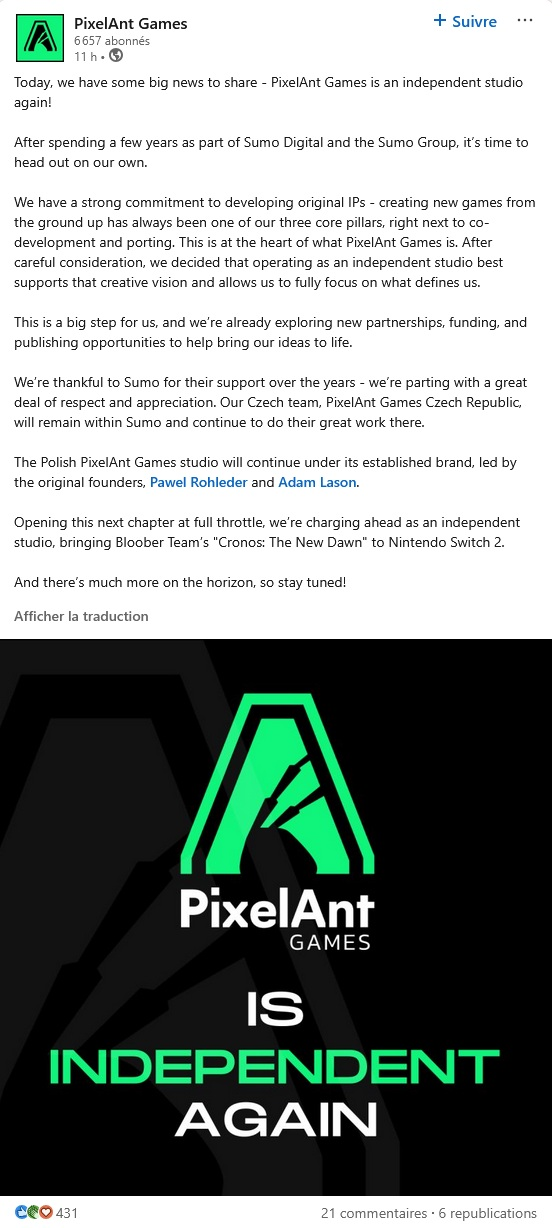 PixelAnt Games redevient indépendant. Le studio polonais, actuellement sur la version Switch 2 de Cronos pour Bloober, rachète son indépendance à Sumo Group afin de pouvoir développer ses propres licences. PixelAnt Games Czech Republic reste chez Sumo. 📰 https://www.linkedin.com/posts/pixelantgames_today-we-have-some-big-news-to-share-pixelant-activity-7370737099400105984--gs https://www.linkedin.com/posts/pixelantgames_today-we-have-some-big-news-to-share-pixelant-activity-7370737099400105984--gs?utm_source=share&utm_medium=member_desktop&rcm=ACoAADil7swBSuw6mJYM9j_-5YnYf3-q99Vy5lc