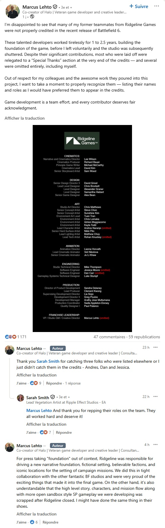 Après avoir fermé le studio Ridgeline Games en Février 2024, Electronic Arts a mis les membres du studio ayant travaillé sur Battlefield 6 dans la case « Remerciements Spéciaux » au lieu de leurs postes pendant le développement auquel ils ont pourtant participé pendant une à deux années et demi :