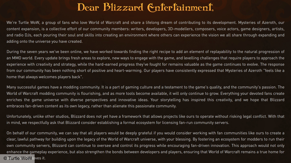 Le serveur privé Turtle WoW, à qui Blizzard demande de fermer pour le moment de façon polie, a mis sur son site un plaidoyer pour des licences pour serveurs de fans :