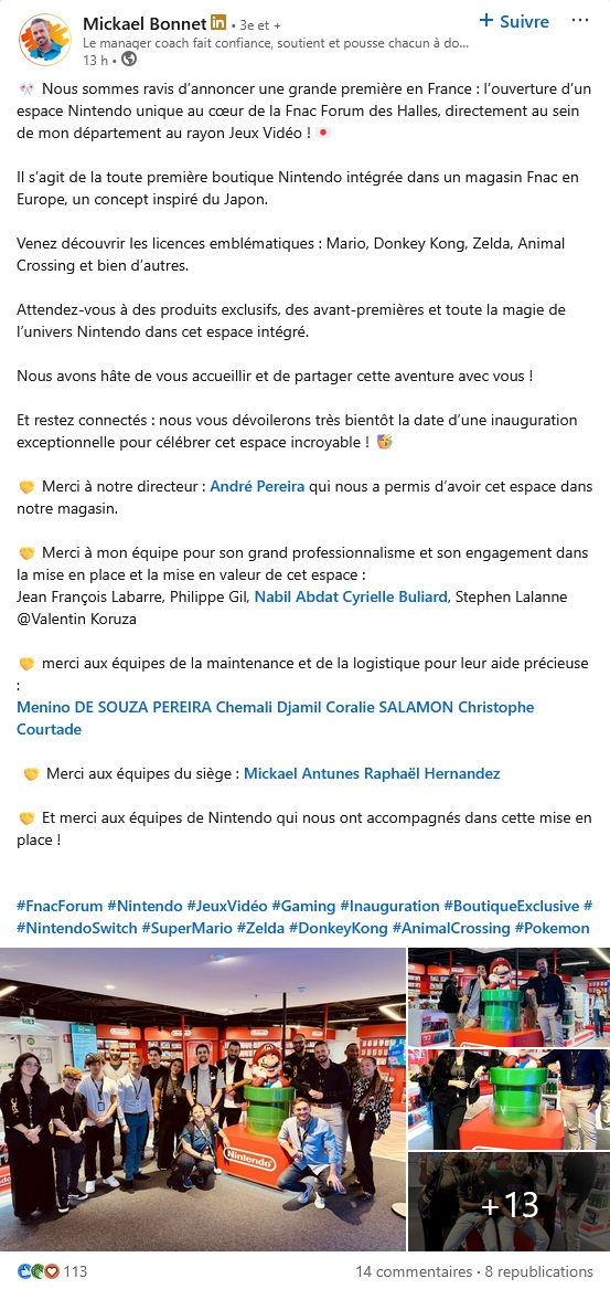 #fnacforum #nintendo #jeuxvidéo #gaming #inauguration #boutiqueexclusive #parisgaming #nintendofans #expérienceunique #nintendoswitch #supermario #zelda #donkeykong #animalcrossing #pokemon… | Mickael Bonnet | 14 comments