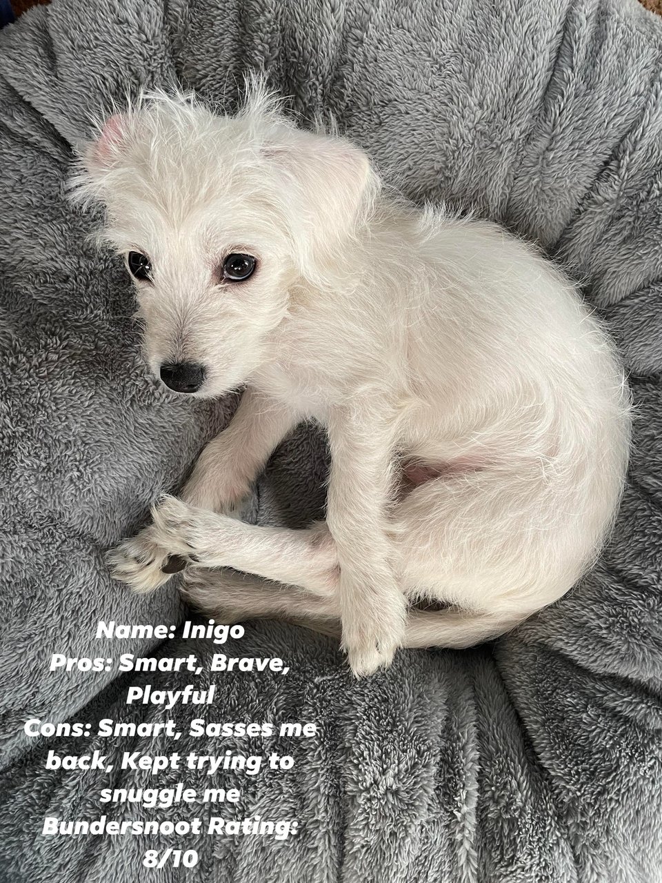 Inigo is a small white terrier who enjoys playing and is both very brave and very smart. This makes him extremely popular with humans for reasons that I do not understand. Surprisingly for a dog, Inigo does not defer to my obvious superiority as a cat and has the audacity to sass me back. Furthermore he kept trying to snuggle me. Thus I must deduct points for my rating of 8/10.
