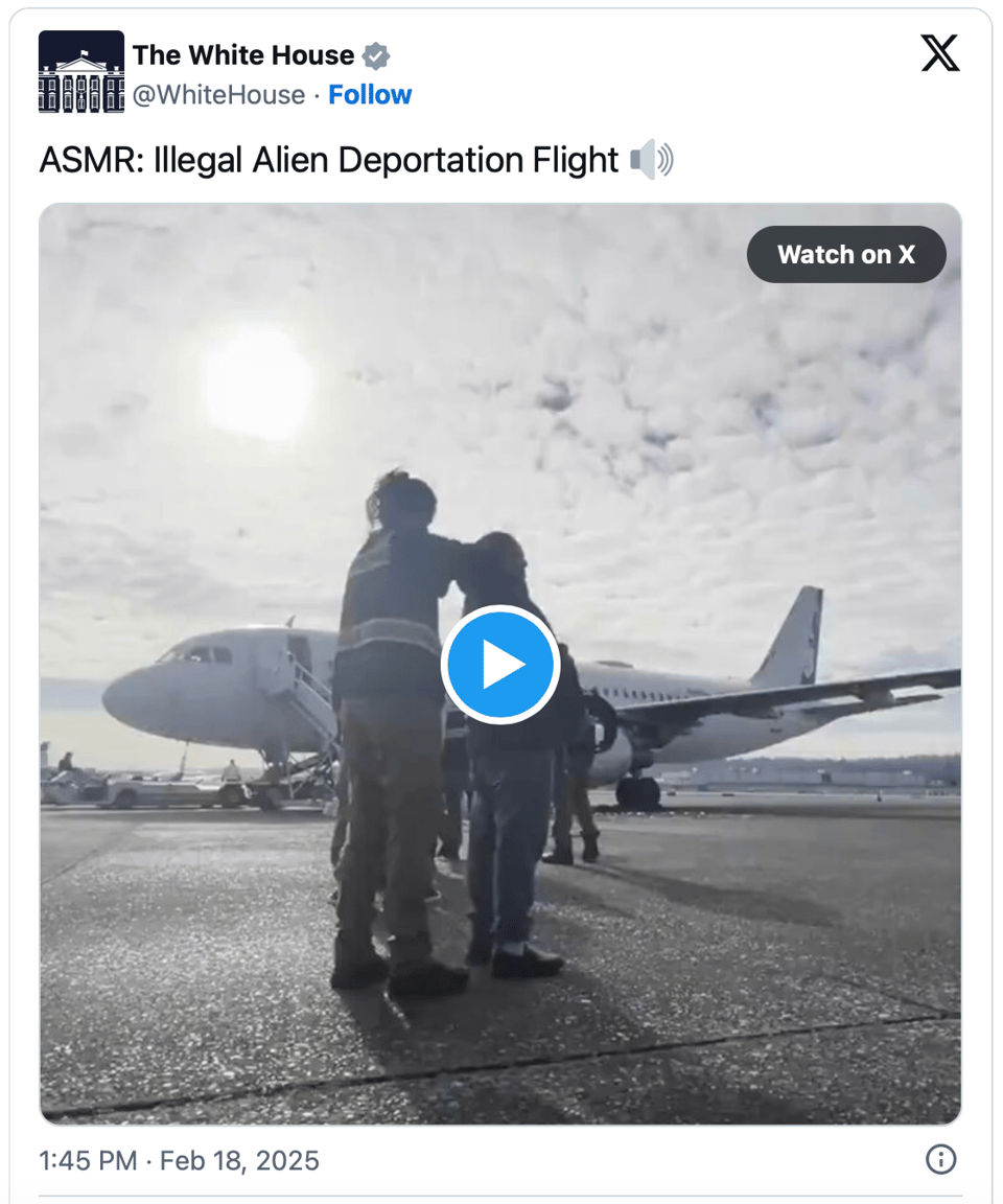Trump and his Homeland Security department have shown great eagerness to round up and deport undocumented immigrants in the largest numbers possible, while making a celebratory show of it. The White House posted a video on X showing federal agents shackling men and escorting them onto a plane in Seattle, with the caption: “ASMR: Illegal Alien Deportation Flight.” ASMR, or Autonomous Sensory Meridian Response, refers to a lovely tingling feeling some people experience while watching videos with pleasing sensory stimuli.