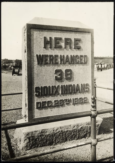 It's not that Mankato had never publicly acknowledged 1862. On the fiftieth anniversary of the hangings, in 1912, the city unveiled a granite monument on a downtown street corner. It looked like a six-foot-tall gravestone engraved with these blunt words: HERE WERE HANGED 38 SIOUX INDIANS DEC 26TH 1862.