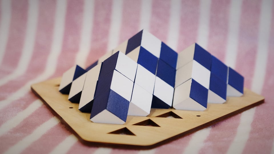 However the game itself is treacherously easy to lose yet deeply strategic and tactical when played by two equally skilled players. The three dimension aspect of the victory goal and the three dimensional aspect of the cube placement can be very tricky to wrap your head around - leading to surprising twists and turns that belies it simple rules and components.
