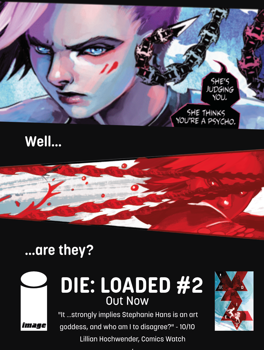 Also, we have DIE: Loaded #2, where we catch up our misadventures as folks explore DIE, we see a new region with a new master, meet some gods and more. Preview pages here too. It’s a packed one – it does remind me as DIE 2, in terms of what it does. There’s also the start of the backmatter, including specific rules and role-play notes for one of the gods. Let them guest-star in your own DIE games at home.