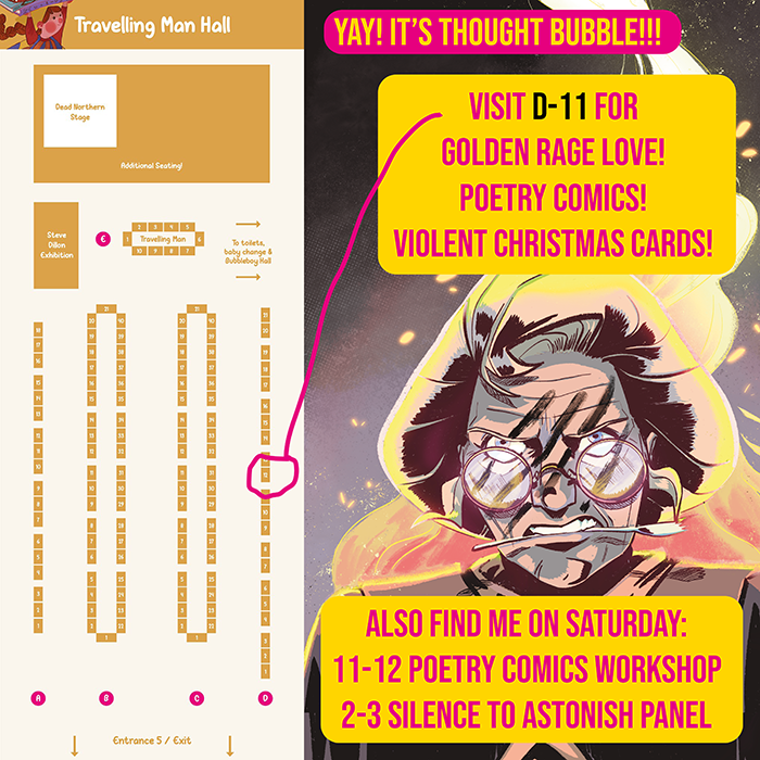 I've got one panel, In Stars and Shadows: Folklore and Mythology in Comics in Panel Room 2 at 4:30 on Saturday, with John Reppion, B. Mure and Juni Ba. Chrissy is running her poetry comics workshop between 11-12 on Saturday and on Silence to Astonish between 2-3 on Saturday. There's also the Midcon party at Mojo Harrogate where the DJs have been organised by Comrade Sarah Gordon, and I may be showing my face, decks and dancing shoes.