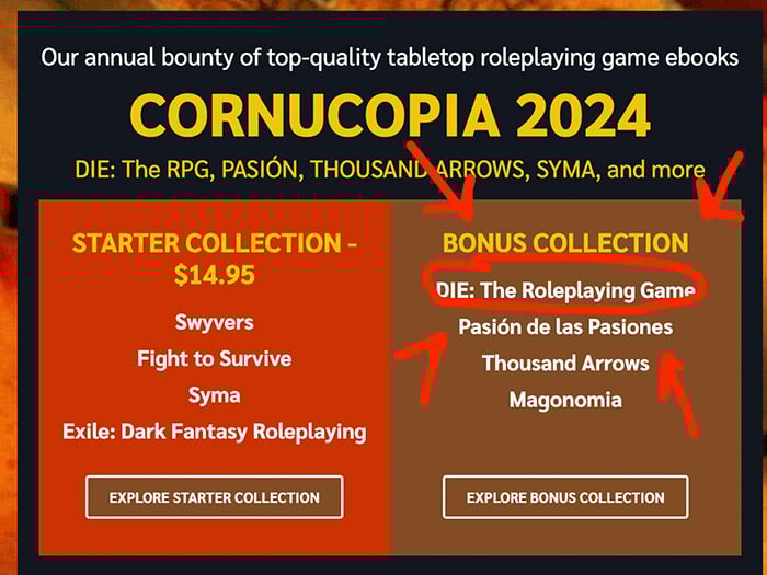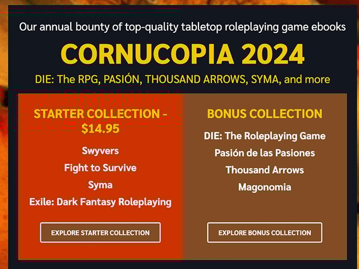 This is probably one ticks off a very weird, specific nerdy bucket list. You'll likely have noticed that I link to Bundle of Holding sales a bunch - if you're interested in tabletop rpgs, it's basically the best way to get hold of a whole load of stuff. Anyway, every year they do a Cornucopia of various games circa-Thanksgiving.