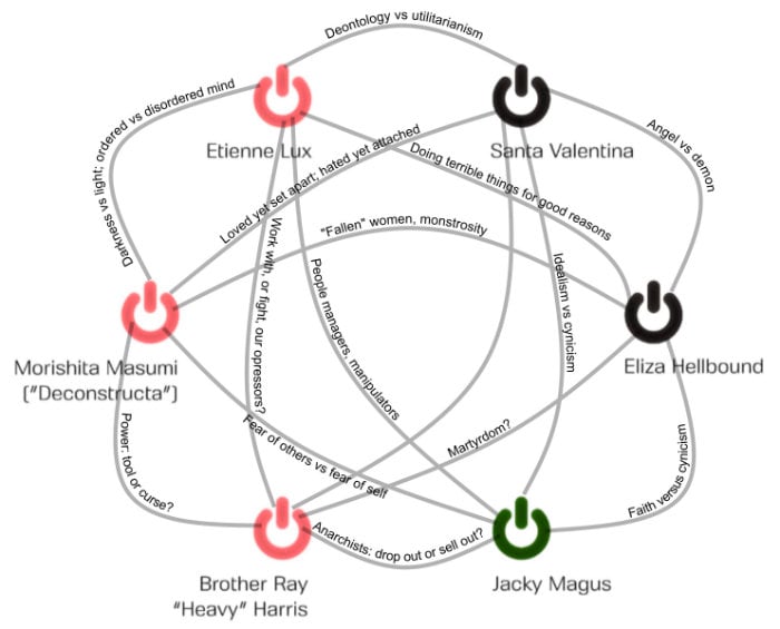 Etienne knows Heavy is hiding a world-threatening son. What’s he going to do? Jacky Magus knows that Eliza Hellbound can stop his plan. Can he convince her to stay on his side? Isabella’s family are dead. Can she do anything about it? No. They’re dead. She’s just going to be sad.