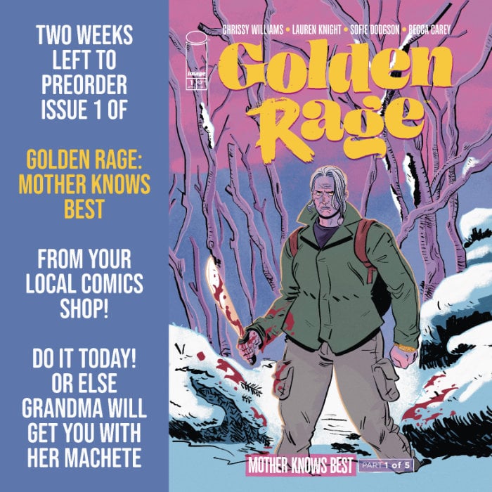 While you're in your shop, you should know that Golden Rage is coming back. Golden Rage: Mother Knows Best goes back to the island and finds yet more drama. I've obviously read all this, and I think it's great – even stronger than the first, and really drilling down to the characters and the drama. While here's a Golden Rage primer for your entertainment,