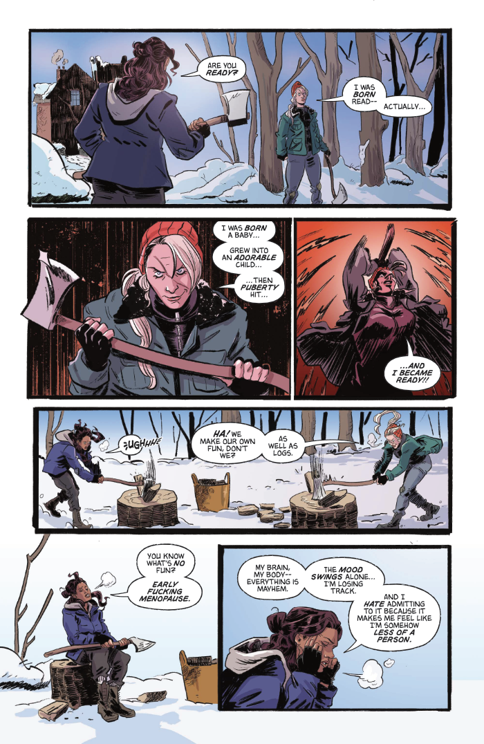 I suppose a more accurate elevator pitch would be "come for the grandma-on-grandma action, stay for the seven-page clowning sequence that explores infertility and pregnancy loss" -- but it's a bit wordy. Hmmm. I guess I would say that, for me, the sheer relentlessness of endless violence sounds a little... implausible? Not to mention exhausting? I mean -- when's the tea coming? Can I have a sit down? Are there biscuits? Battle Royale is definitely in there, but I wanted something just slightly more grounded. I think it's a reflection of the ages and life experience of the characters. Battle Royale was about being a teenager - my favourite age for melodrama. By the time we get to menopause, I feel like everyone deserves their own internal Bea Arthur, rolling her eyes at how ludicrous the world is. You need humour to survive, I think.