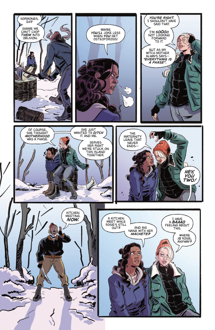 Well, we certainly don't have as much to say about Blondie as Phonogram does... There are two sides to this. One is just wanting to be back in that world, to figure out what would happen to these characters next. Both Lauren, the artist, and I really do love these characters a lot, and we love spending time with them. Two, having established this optimistic community, I wanted to think more about how it might actually work. It's a way for me to channel ideas about female friendships and support networks, and especially intergenerational trauma and relationships, as well as what can challenge our sense of community, whether internal politics, or physical hardship, health, family, personality, even. Also I wanted to set it in winter, because blood on snow looks awesome.