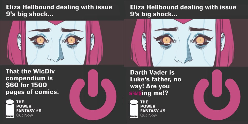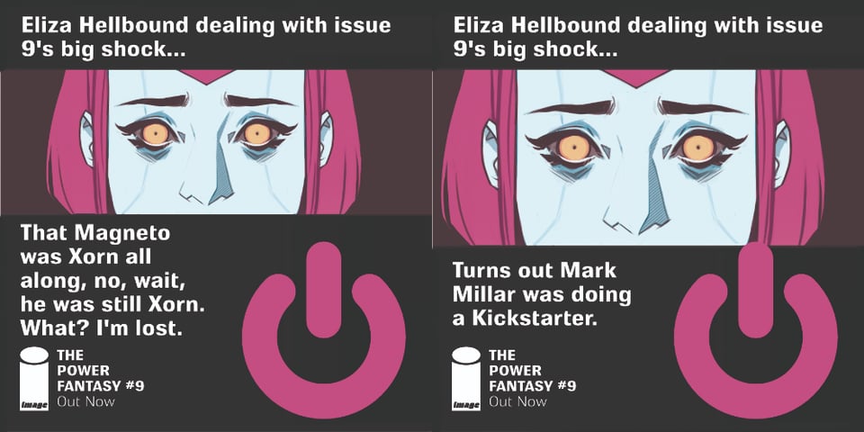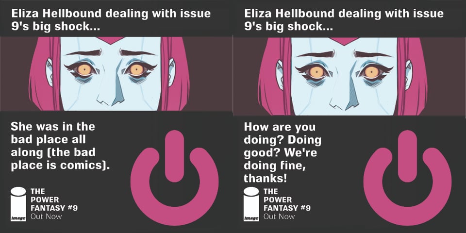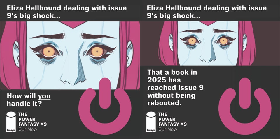 While we’re on a The Power Fantasy teaser tip, I didn’t do a newsletter last week due to reasons (wizard reasons) so haven’t had a chance to show you the (er) ten of these I released after issue 9 came out. Here they are.