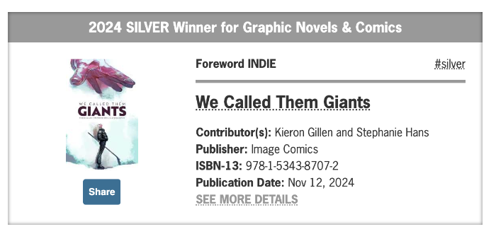 This was lovely. The Foreword reviews indie awards announced their winners, and We Called Them Giants got the Silver award for Graphic Novels and Comics. Picked by librarians and retailers, it’s just lovely to be highlighted by folks who really do see a lot of books.