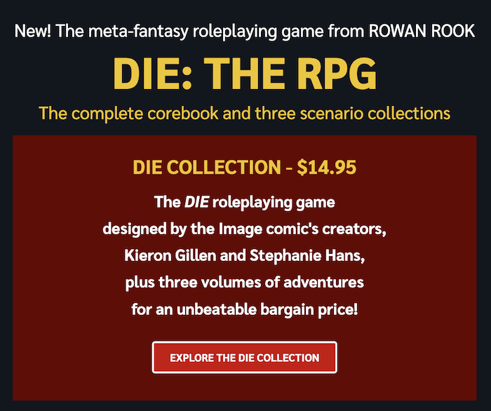 For $14.99, you can get the DIE: RPG core book, plus the three adventures modules and the quick start. The pack also includes a 15% off voucher if you want to buy physically from RR&D.