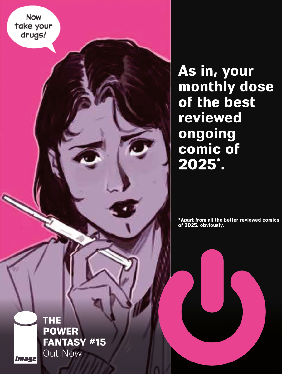 The Power Fantasy #15 is out today. I think it’s a good one, and from the responses I’ve seen, I don’t think I’m alone on that. Also, I did a quick glance around the fandom first thing in the morning, and someone was already just posting spoilers. I’d suggest grab your copy before risking going such places, in case someone just blurts out that it was all a dream.
