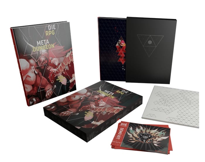 The Digital, Standard, and Special Edition pledges get you the Metadungeon in its entirety as either a PDF, a standard hardback edition or a special edition that will pair beautifully with the existing special edition DIE: RPG rulebook. If you buy a printed book, you'll get the PDF for free.