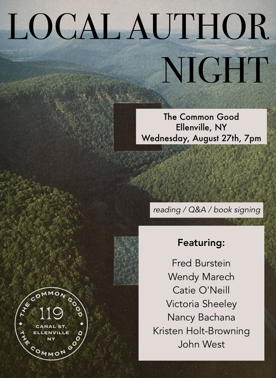 Next Wednesday, August 27, I’ll be taking part in this very fun and cool event at The Common Good in Ellenville, NY: