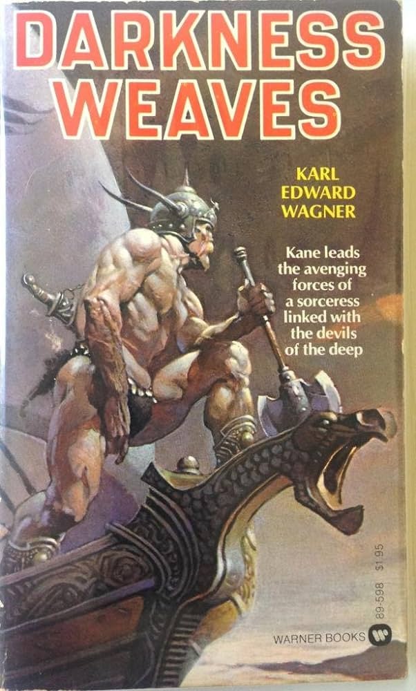 I was reading Flame and Crimson: A History of Sword-and-Sorcery, when I got to the description of Karl Edward Wagner's Kane stories. I'd never heard of them before, and I was curious, so I paused in reading about the history of the genre to read Darkness Weaves. As you can see in the blurb on the paperback up there, in this book "Kane leads the avenging forces of a sorceress linked with the devils of the deep". As sword & sorcery writers go, Wagner is not on the same level as the great Fritz Leiber (though really, who is?), but he grabbed my interest and kept it until the end. The story moves very quickly, chronicling political intrigue, war, and the fate of nations all in just a couple hundred pages (I assume; I read a digital copy).