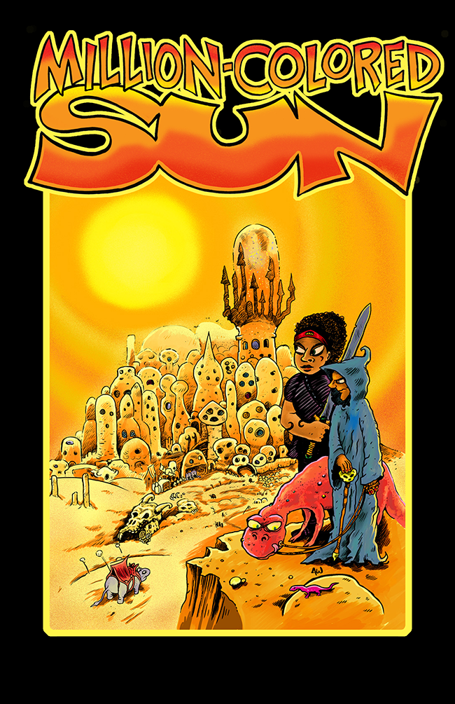Million-Colored Sun is a rules-light RPG that allows you to create characters quickly then play out your own sword & sorcery adventures. Climb a mile-high tower in the middle of a desert, only to discover its pulsing organs and realize the tower is alive; buy an enchanted carpet in a marketplace and fly to a city in the clouds; step through a magical painting and find yourself in a world of endless blue.