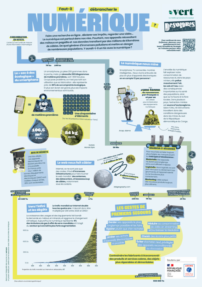 Nous avons collaboré avec le média Vert et l’Ademe pour réaliser un poster de quelques chiffres sur l’empreinte du numérique. À commander ou imprimer sans modération.