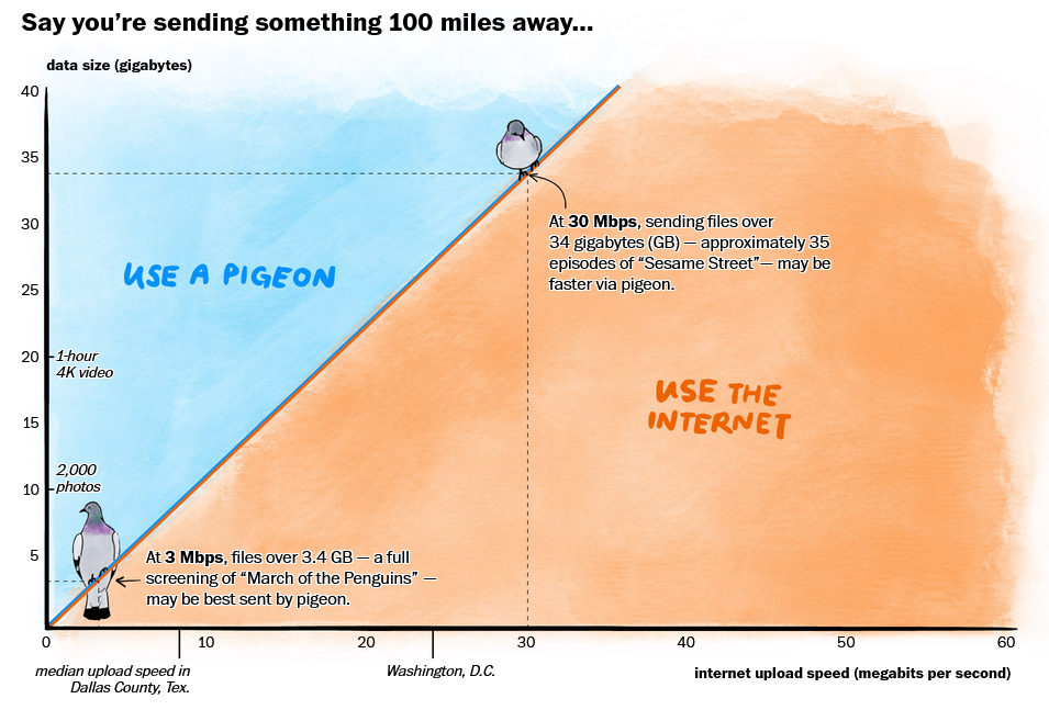 Si vous vous demandiez bien évidemment quand est ce qu’envoyer un pigeon est plus rapide que votre internet, voici un schéma :