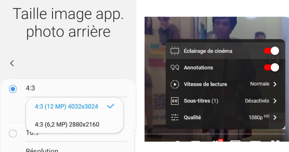 À gauche la résolution par défaut de votre app. photo est toujours celle qui possède le plus de megapixels bien que la qualité n’en dépende pas vraiment. À droite la nouvelle fonctionnalité éclairage de cinéma, consommatrice de ressources est activée par défaut.
