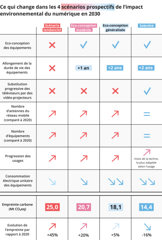 Enfin le 4ème scénario est le seul qui conclu à une réduction des impacts du numérique en alliant éco-conception généralisée et une stabilisation du nombre d’équipements comparé à 2020.