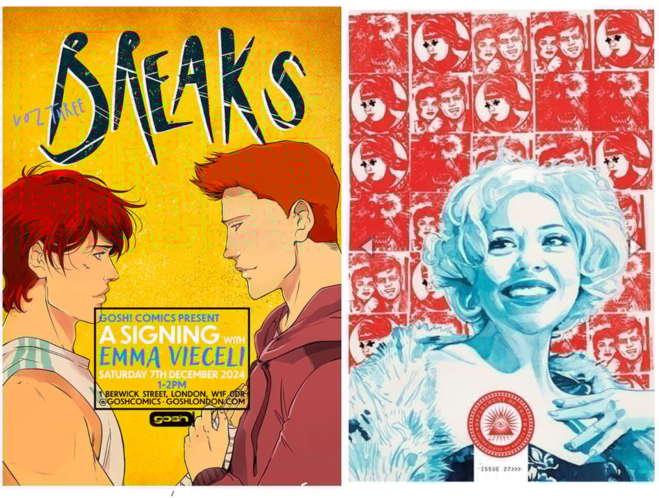 For the curious thrill seekers D.O.T’s latest issue #27 focuses on the elevation of Norma Jean to Marilyn but things aren’t exactly what you thought and there’s some visitors messing with the timelines. The art on this is gloriously bonkers and beautifully drawn by my pal & comics conspirator Alison Sampson. Both my daughter & I get cameo appearances but I will actually be disappointed if you do recognise me in this (*Spoiler: I am not Marilyn). Grab a copy wherever you get your comics. Lastly another talented pal Emma Vielceli is launching Vol.3 of her rivals-to-romance comic series Breaks with a signing at Gosh! on Sat 7th. If you can’t join us to celebrate Emma and her stellar talents then pick up a copy from Gosh afterwards. There’s bound to be a few signed copies available.
