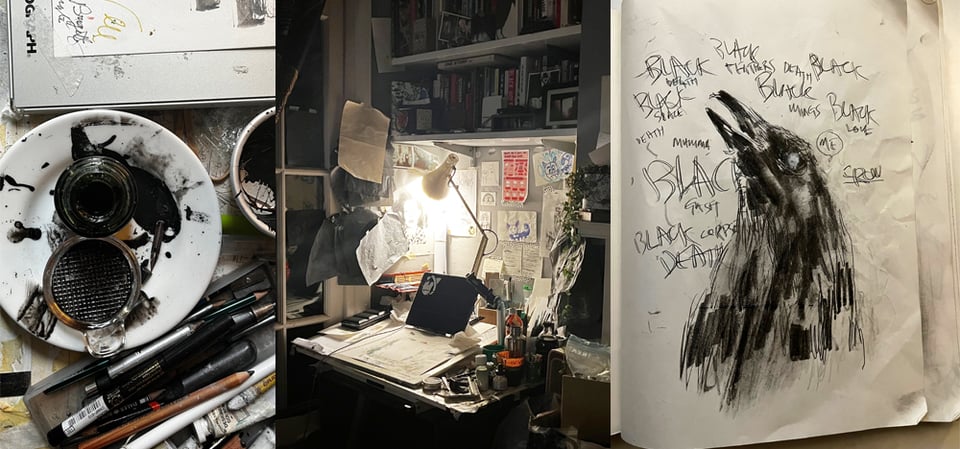 Apologies for not saying it here first. As mentioned I signed a somewhat terrifying contract that meant I was very cautious of saying anything but then one day, out of the blue, I was announced as working on the adaption of Max Porter’s acclaimed novel GRIEF IS THE THING WITH FEATHERS, starring Benedict Cumberbatch and Written/Directed by Dylan Southern (Rank+File). I first spoke to Dylan about the film back in the first Lockdown when he’d decided to change the character DAD to a graphic novelist and was looking for an artist to draw the work as well as making sure he had written the details of his practice accurately. I was suggested by Max Porter and Dylan alike having both read BARKING, which was hugely massaging for my ego. I love this book. I read it whilst drawing the final stages of BARKING and when I completed my book we celebrated by catching the theatre adaption starring Cillian Murphy at The Barbican. Max approached me about buying a copy when my book came out, I offered to send it for free as I was so influenced by his book but he declined with (I quote) “Fuck that. I’ll buy it but it better be good”. Luckily he thought it was, calling it ‘a terrifying and beautiful book’. Obviously it was an instant yes to being involved in the film. Then the world went into lockdown and it all went quiet for a good while. I was saddened but figured they may have found another artist & moved on. Then at the end of ’23 Dylan dropped me a line saying production was getting going and was I still keen? We took a walk and discussed the adaption and I sketched, we discussed more and talked a lot about comics and found much similarities both in our work and our lives. Dylan is a comics fan to rival many and loves the form so rest assured any aspect of comics in the film has been long considered and lovingly advocated for.