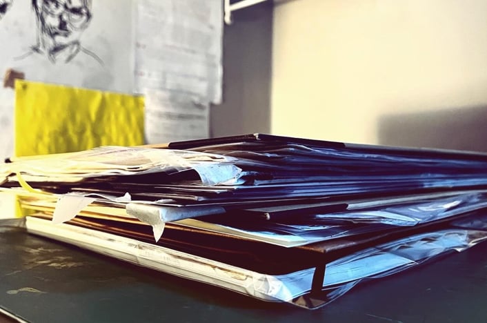 My role was to be Art DAD (Off screen) and produce all artwork seen drawn or strewn around DAD’s studio, itself inspired by my own cluttered workspace but bigger and neater. I won’t spoil anything of the story in saying I drew some very dark things, I even had to research which search engine wouldn’t ruin my algorithm as a result of what I was looking up as it was pretty gruesome (it’s DuckDuckGo by the way). The art I made will be mere snippets on screen I’m sure but it was an intense time in my head. I produced 2 sketchbooks along with dozens of individual pieces in a variety of styles, media and formats as well as teaching Cumberbatch how to draw with carbon and being a part of filming on set including for a very ink laden scene.