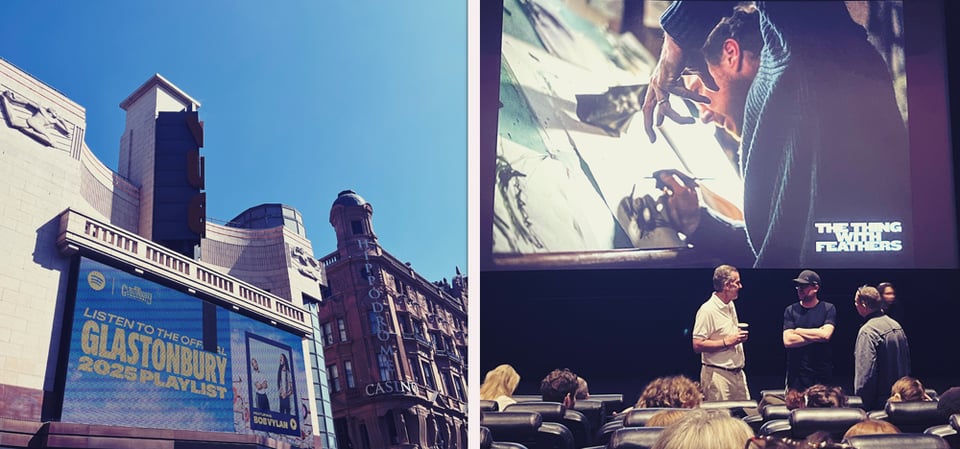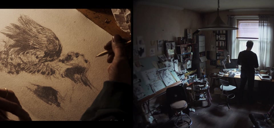On a far-too-early Sunday morning, I was back in the West End to watch the Cast & Crew screening of THE THING WITH FEATHERS. This was the first time I saw the finished film on a cinema screen and my artwork at a scale I’d never imagined. I knew much of the storyline and how emotional a film it was so it was a great relief to find myself sat next to our Production Designer Suzie Davies. Suzie is renowned for her craft and skill, having designed films such as Conclave, Saltburn, Mr Turner and many more. Luckily she was also deeply affected by the film so, after admitting to each other we would probably cry, we settled in to watch.