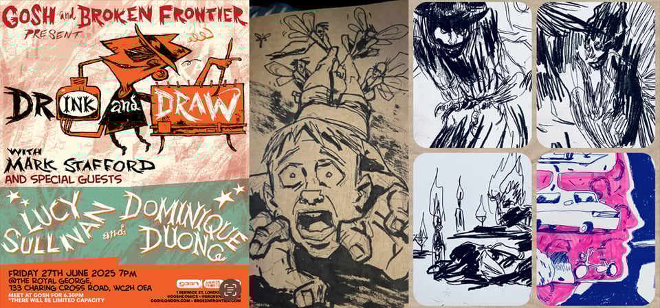 June closed with the much needed return of Gosh / Broken Frontier Drink & Draw - IN PERSON! I was invited as a guest artist alongside Dominique Doung and Mark Stafford to brave the heat and assemble for some sketching at The Royal George. Guest Artists chose a theme for each round and we sketched, chatted and celebrated the chosen winners. It was really lovely to see lots of friendly London comic faces and be reminded of what a brilliant scene it is. A touch of sadness there as my family were soon to leave the city for Brighton but what a lovely send off it was.