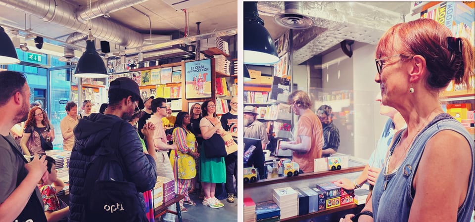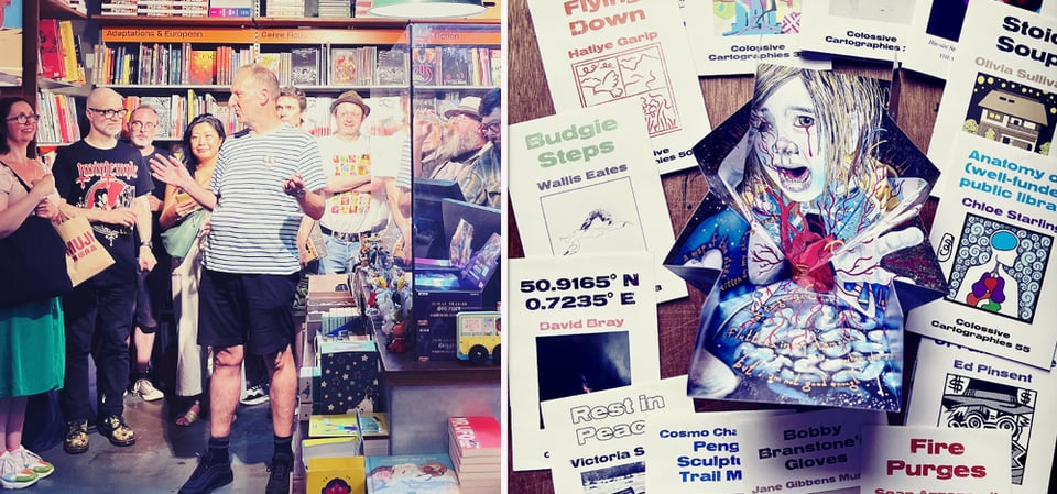 The heat of Summer was in full swing when a gaggle of comic creators coalesced at Gosh to celebrate Colossive Cartographies 5th Birthday. We braved the sweltering tube to come together and thank Tom & Jane of Colossive Press for inviting so many of us to contribute to this fantastic zine series. If you’ve yet to grab a set the Cartographies are 1 page zines, each designed by an artist and folded (by Tom) in a glorious Turkish fold.