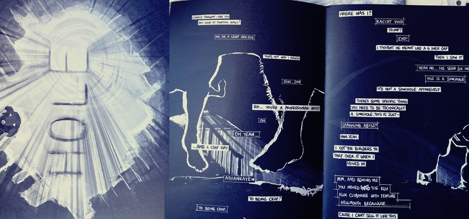 Fortunately my spirits were lightened by Hole by my friend and fellow comic creator, AJ O’Neill, who took the discovery of a void under the back of my London home into an entirely new dimension. Literally. AJ has an incredible touch for natural dialogue and a fresh style of art. They are a new voice to comics but a creative from way back when. I strongly suggest you grab a copy and look forward to bragging rights when AJ is talk of the (comics) town.