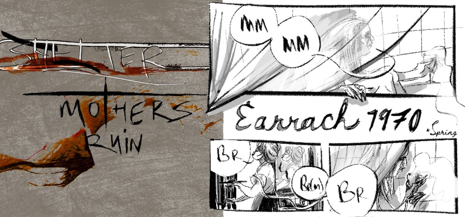 I’ve started a new process in making this section of sketching thumbnails and writing the script at the same time. I used to separate the two disciplines but then spent time bringing them together which seemed a waste. Instead I now flit between with a sketchbook at my writing desk to scribble out layout ideas and figure out character looks. It’s been a fruitful approach and one I plan to continue for the rest of the story. I handed over the dummy book & script for Spring along with the full outline to my editor and awaiting our first chat about the story so far. Avery Hill recently announced they will be publishing Mothers Ruin in fall 2027. It seems a long way off yet but as the 1st chapter is already longer than the whole of Early Doors… Suffice to say I have my work cut out. I’m still planning to produce the book in watercolours but leaning hard to using ink on top to give myself some greater control. I’ve resisted it as a medium for a long time as I’m such clumsy artist and usually end up making a right old mess. I think the art needs a clearer line so floors be damned. I’ll be focusing on making the book for all of ’26 so will be updating seasonally on it here.