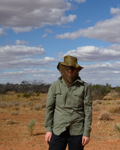 Each day, I would drive out to segments of the park, hang up paper and take photos. The desert is windy, so I needed all the clamps on my shirt to hold the paper to the fence, and I needed my flyscreen hat to keep the 100s of flies off me. I'm not exaggerating when I say that I was often covered in flies - my hands, my shirt, my back, everywhere. Only the net stopped them pushing into my eyes, earns, nose and mouth. My girlfriend has discovered a dead fly or two in our car and, frankly, I'm amazed there's one that few.