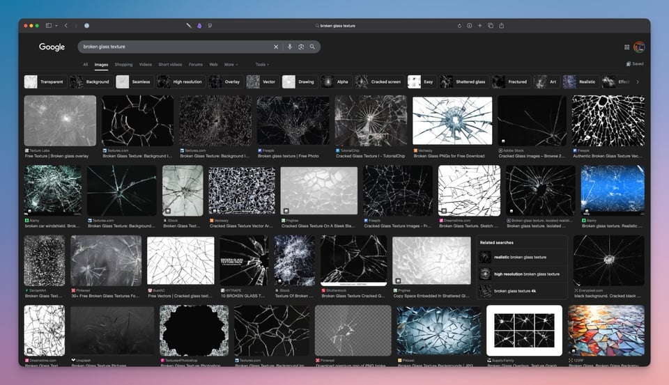 So why go through all this instead of just grabbing something off Google? Peace of mind and some tiny semblance of control. I don't have to worry about violating some license agreement, even if I am never actually pursued. I got to kind of get a version I like; certainly more than the ones off Google Image Search. Am I breaking some sort of moral artist contract by using AI-generation for a broken glass texture? I don't think so.