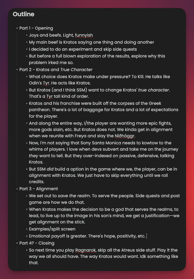 I am really trying to keep the scope in check and the video time in between 10 and 20 minutes. While I love a good 45 minute monster, I feel like that length would be a detriment to the elements I am exploring with this topic. I discovered something cool in Ragnarök that addresses my biggest issue with the game, but it is buried waaaaaaaaaay at the end. That's the focus. I suppose I want to avoid pulling my own Ragnarök when I think about it...