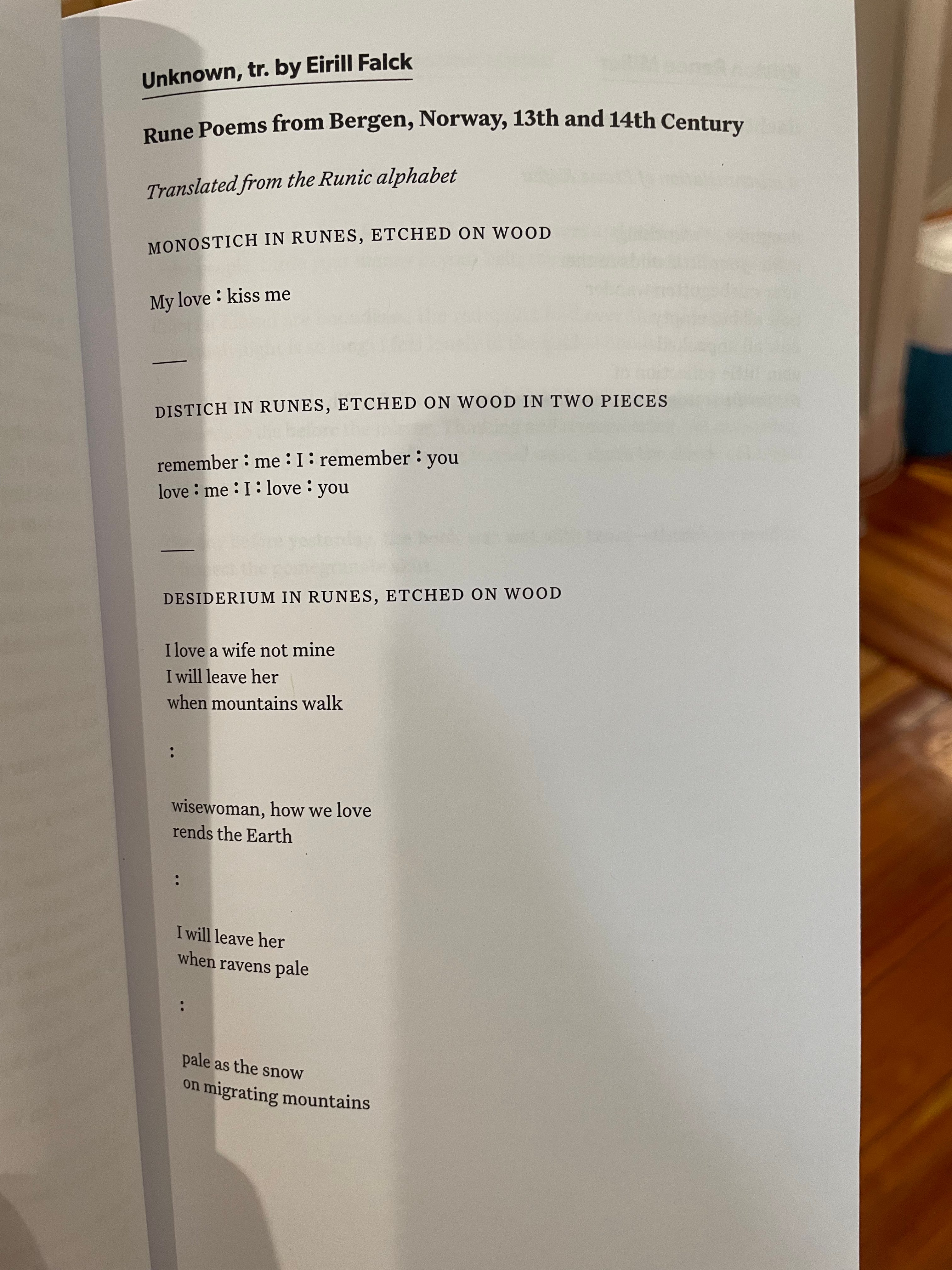 These rune poems from Bergen, translated by Eirill Falck, in the most recent issue of Poetry Magazine: