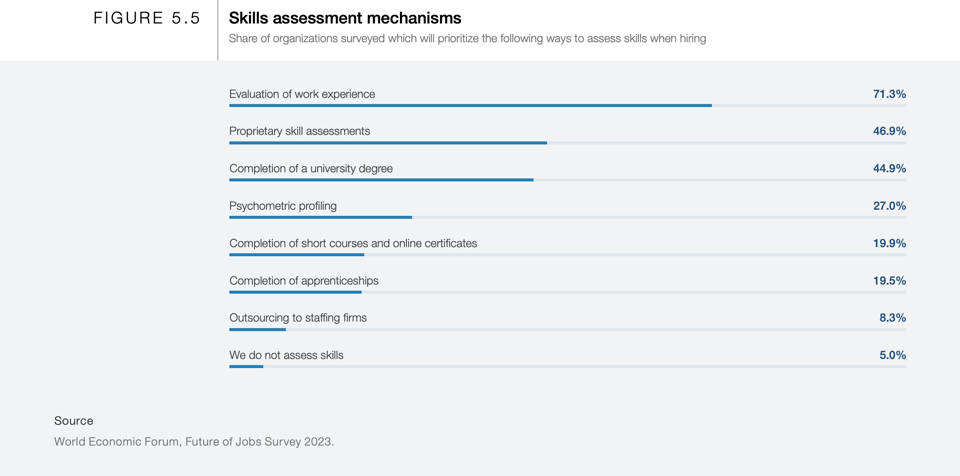 Taking online certificate courses at places like Skillshare, Coursera, or a local university extension is underrated. Right now only 19.9% of companies prioritize certificates when hiring, but according to the WEF, “The fraction of employers who consider microcredentials may indeed be expected to increase, given that 82% of companies plan to adopt education and workforce development technologies in the next five years.” Basically, since these companies are going to be asking their current workforce to undergo similar courses in order to keep up, the value of said courses for job seekers will also rise.