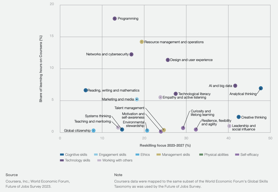 The WEF paper had a big emphasis on what topics employers are going to focus re-skilling efforts on over the next five years. This is great, because it shows us what skill deficits exist in the current workforce. When the WEF compared those desired skills to the share of hours Coursera learners spent on a given topic, it produced a supply and demand graph: