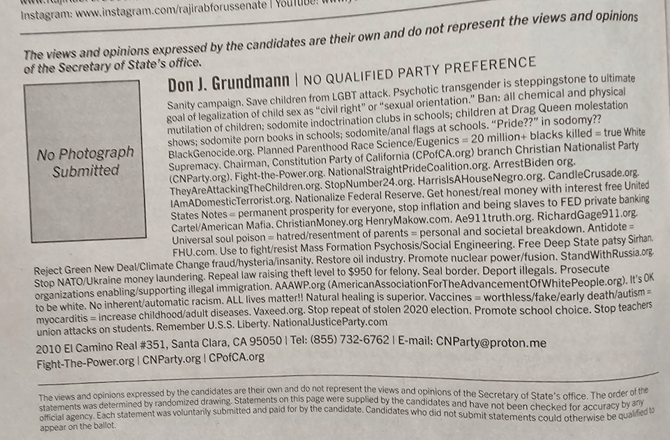 From what we can see, divine intervention doesn’t win elections. According to his Ballotpedia page, when he ran for Senate in 2018, he got 15,125 votes (28th place). In 2022, he got 10,181 votes (22nd place). The California Constitution party isn’t even big enough to qualify for the ballot, so Don runs as an independent.