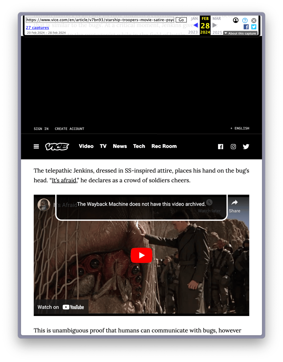 I don’t fully understand the technical challenges behind archiving images, but I know the big challenge for videos is copyright. If they wanted to properly archive this article about Starship Troopers, they would have to download and upload copyrighted footage. Which is piracy. That’s fairly innocuous when individual users do it (the movie clip in that article was uploaded by Youtube User “Video Quoter” eight years ago and it hasn’t been taken down) but if a large charity like the Internet Archive was downloading and re-uploading huge amounts of copyrighted material, they could be sued out of existence.