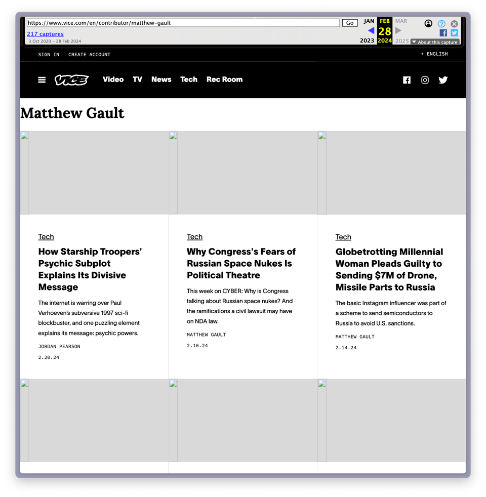 The only issues with Wayback Machine's archive is that pages load slowly and most of the images don’t work. For instance, here’s what former Vice staffer Matthew Gault’s staff page looks like: