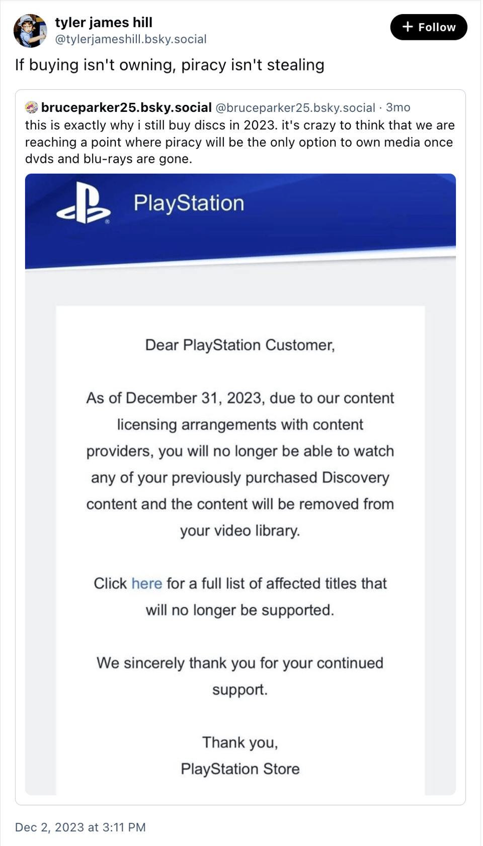 For instance, this happened to Playstation owners two months ago, when hundreds of purchased shows were removed from user’s libraries.