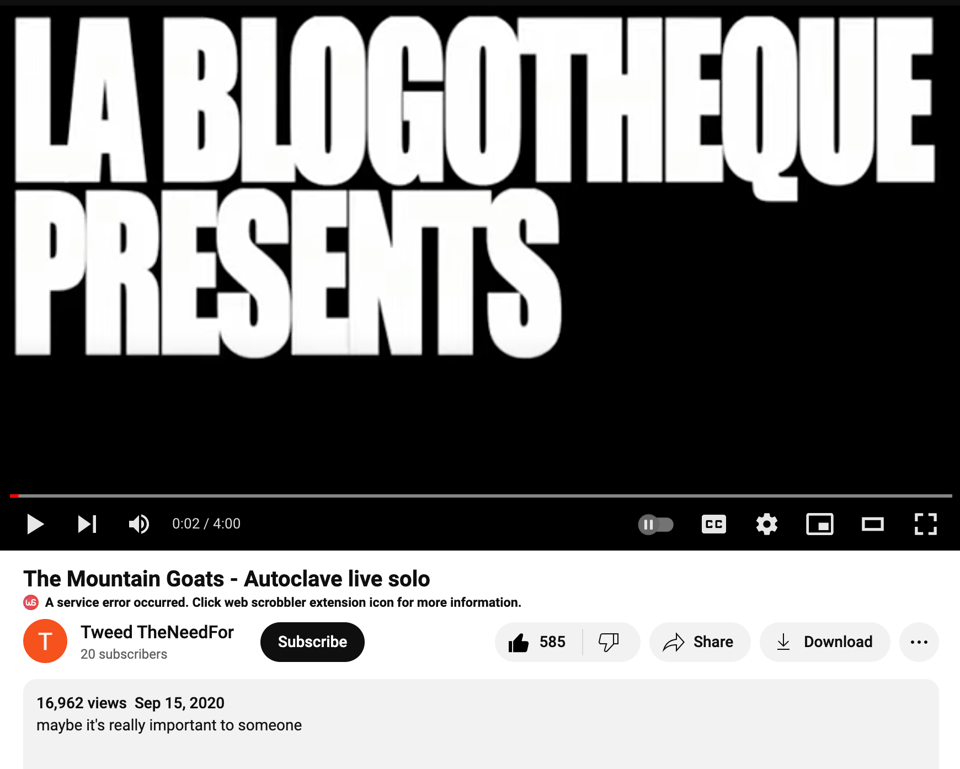 One of my favorite videos on the internet is, technically, pirated content. It’s this live performance of ‘Autoclave’ by the Mountain Goats, performed next to Seattle’s Fremont Troll. It was recorded by S. Viehmann in 2008. In September of 2020, when we were all hiding in our homes, youtube user ‘Tweed TheNeedFor’ uploaded a bootleg with the simple description “maybe it’s really important to someone.”