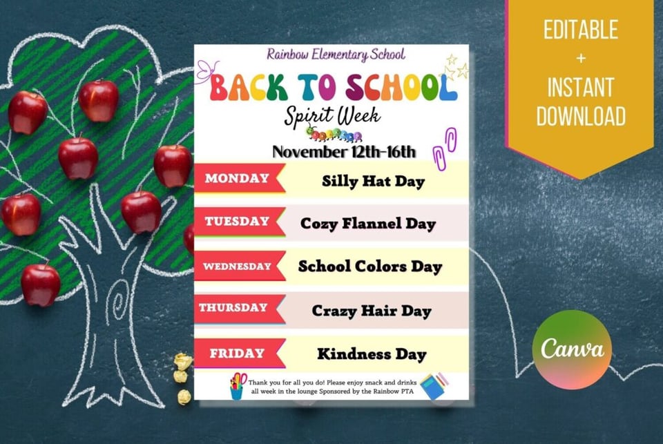 Stop wasting time on generic flyers. Download our editable Back to School Spirit Week flyer template today and create stunning, customized promotions in minutes. Get noticed, save time, and boost your impact. Shop Now!