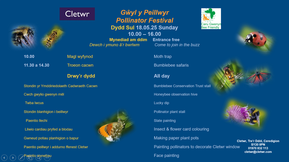 WEBINARAU Lles Pryfed: Beth Sy’n Dda i Bryfed? Archwilio ymdeimlad, poen a lles pryfed. Nos Fawrth 20 Mai 7-8pm. Dysgu am Chwilod Rhwbio yn y DG. Nos Lun 19 Mai 6.30-8pm. Dysgu sut i adnabod cennau a sut mae’r rhywogaeth hon wedi ymaddasu i amrywiadau’r llanw, pori gan greaduriaid di-asgwrn-cefn ac effaith yr haul. Dydd Mawrth 27 Mai, 11.30am-12.30pm. £10. | WEBINARS Insect Welfare: What Benefits Bugs? Exploration of insect sentience, pain and welfare considerations. Tuesday 20th May 7-8pm. Learn about Chafer Beetles of the UK. Monday 19th May 6.30-8pm. Learn how to identify lichen and how this species have adapted to the vagaries of the tides, invertebrate grazing and exposure to sun. Tuesday 27th May 11.30am-12.30pm. £10. |